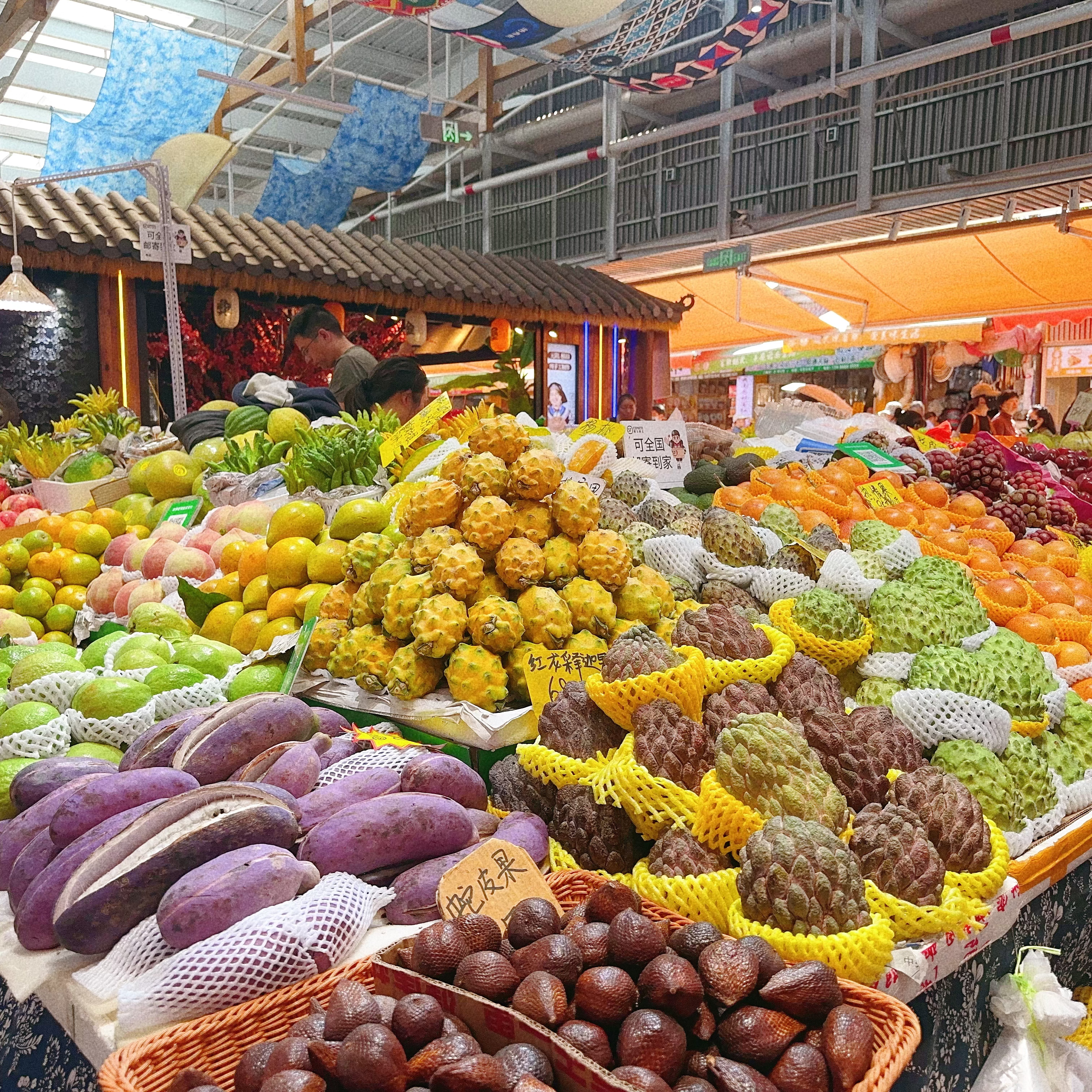 水果攤位色彩斑斕,云南石榴、藍莓、雪桃、芒果香氣撲鼻;